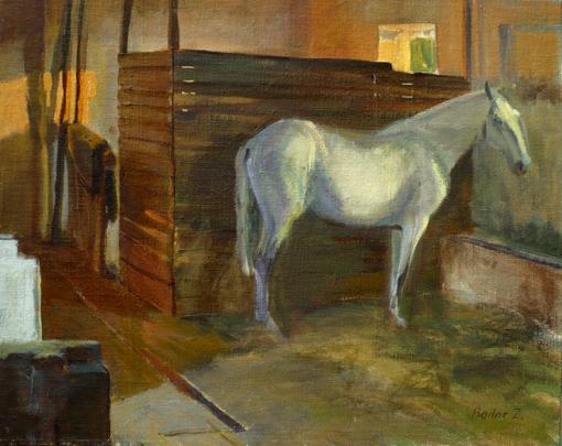 ... Attól fogva, hogy az istállóba besütött a lemenô nyári nap, már nem a lovak érdekeltek. Persze jobb volt, hogy egy idôsödô lipicai („Dollár"), szóval egy szürke állt ott, színe érzékenyen követte a fényváltozásokat. Így két kép készült. „Valamivel este nyolc elôtt" talán öt-tíz percig volt hasonló karakterű a látvány, ilyenkor legtöbbször nem is festettem, csak néztem, próbáltam magamban rögzíteni a színviszonyokat.